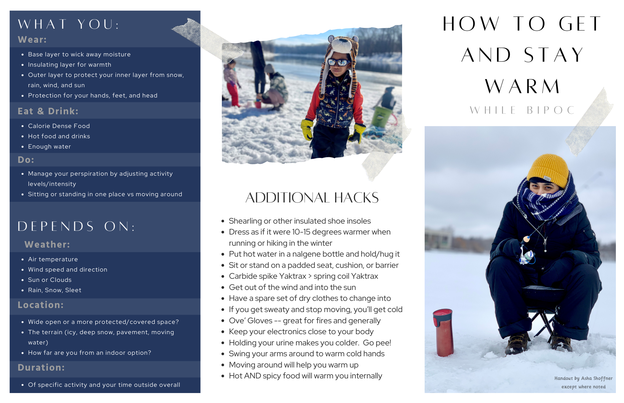 Note: The information below was created by Asha Shoffner, except the great layering infographics, which were created by jlavalleydesign.com. This information was created to be printed for a 11x17 trifold pamphlet, which is why it might look weird on this website, but I hope it helps you get a better idea of how to get and stay warm.